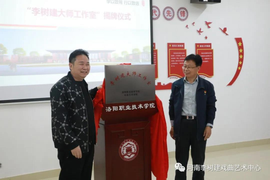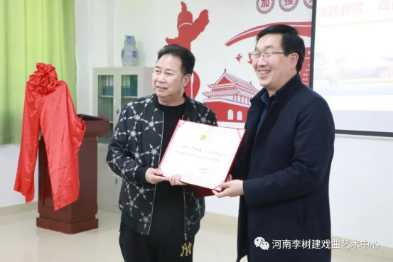 程相朝向李树建颁发洛阳职业技术学院特聘教授和戏曲艺术学院名誉院长、首席专家聘书,朱美荣和李树建共同为“李树建大师工作室”揭牌。