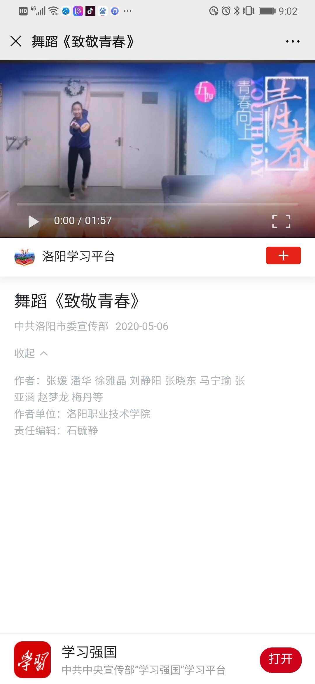 我院教师张媛辅导学生创作舞蹈《致敬青春》选登“学习强国”
