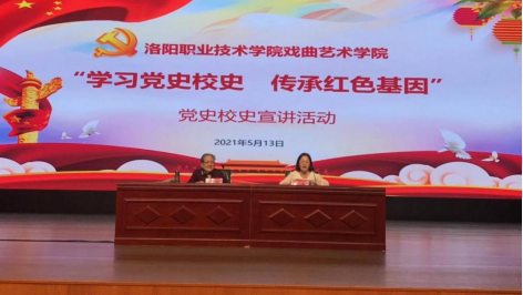 5月13日,洛阳职业技术学院戏曲艺术学院演出实训剧场开展“学习党史校史 传承红色基因”宣讲活动。原洛阳文化艺术学校副校长王良利担任宣讲人,洛阳职业技术学院原院领导、关工委执行主任杜跃钢,人事处副处长郭宝乐参加本次活动,活动由戏曲艺术学院院长潘华主持,戏曲艺术学院全体师生参加宣讲活动。