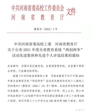 2021年10月15日,中共河南省委高校工委、河南省教育厅下发了《关于公布2021年度全省教育系统“两创两争”活动先进集体和先进个人评选结果的通知》(豫高发〔2022〕3 号),我院王雪涛教师获“河南省文明教师”荣誉称号。
