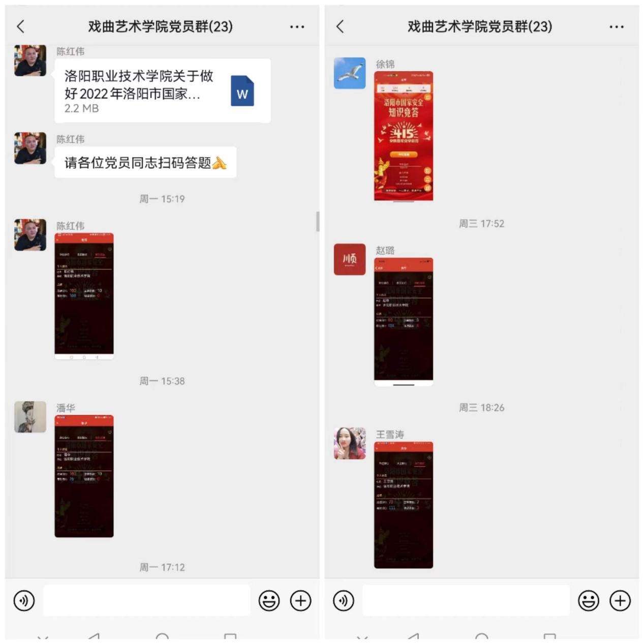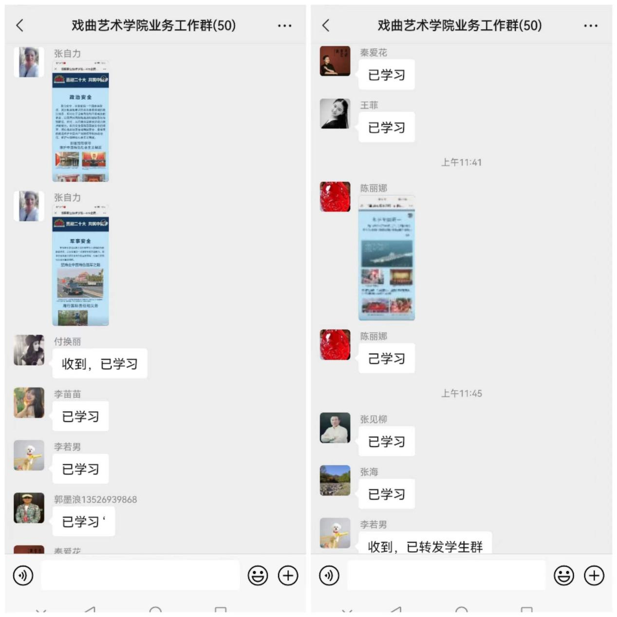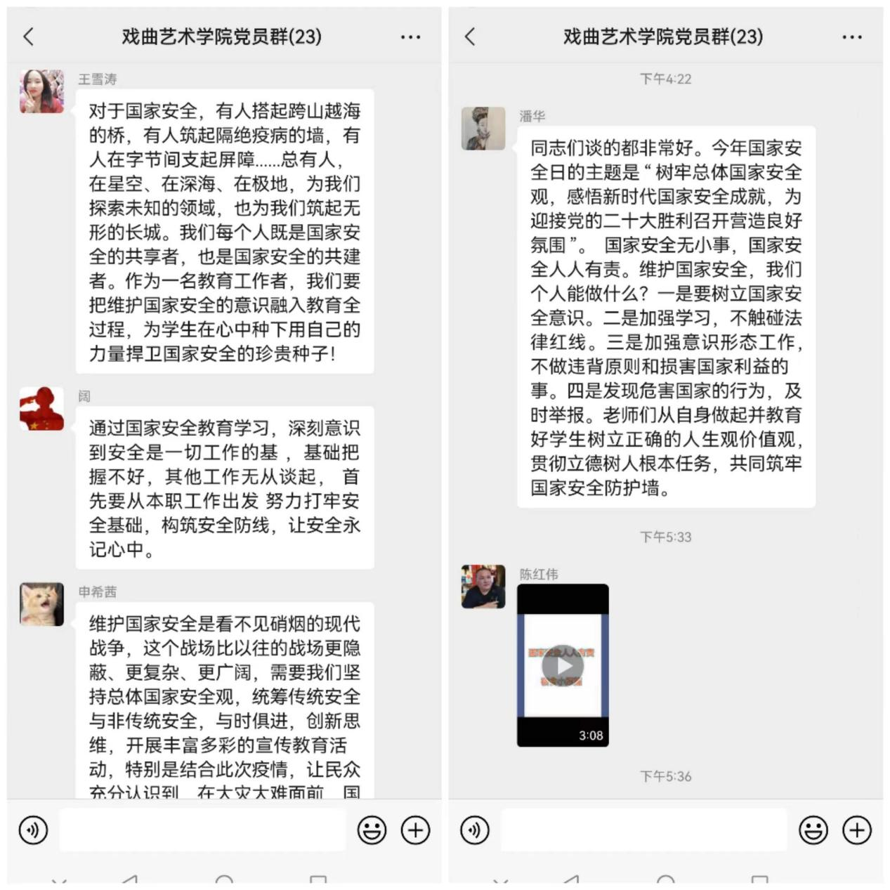 戏曲艺术学院全体党员教师立足实际工作,围绕“全民国家安全教育日”活动主题,在微信工作群中各自发表感言、交流心得。大家纷纷表示通过此次系列活动深刻认识到“国家安全无小事,国家安全人人有责”。要树立国家安全意识,加强学习不触碰法律红线,加强意识形态工作,不做违背原则和损害国家利益的事,发现危害国家的行为及时举报。要从教师自身做起,教育好学生树立正确的人生观、价值观,贯彻立德树人根本任务,共同筑牢国家安全防护墙。