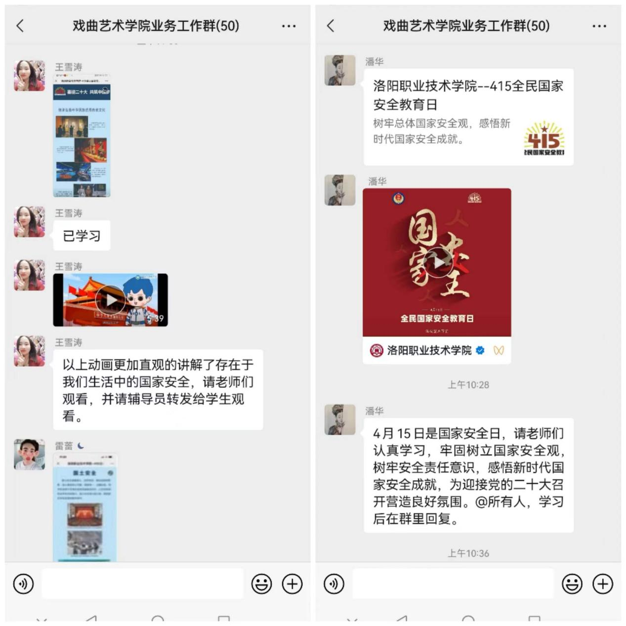戏曲艺术学院通过组织辅导员、思政教师和全体任课教师采取线下集中学习和线上利用微信工作群开展宣传教育工作。组织学生通过主题班会、拍摄短视频等不同形式,将国家安全知识进课堂、进校园。通过加强师生对《国家安全法》、《反间谍法》、《网络安全法》、《突发公共卫生事件应急条例》等涉及国家安全法律法规的普法进行内容学习。组织全体教师参与线上“2022年洛阳市国家安全知识竞答”,共同观看洛阳技术学院全民国家安全教育日主题宣传片活动,加深活动实效。
