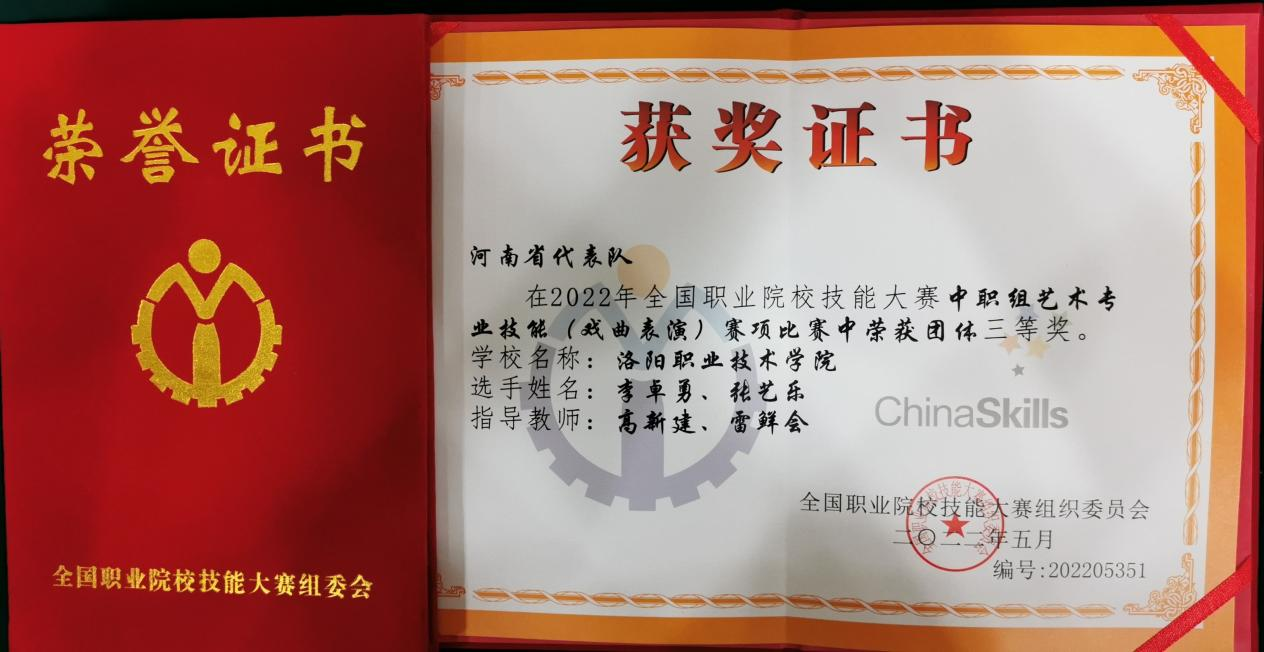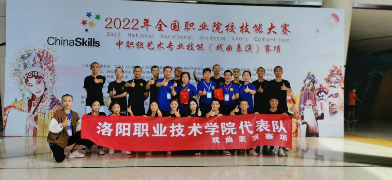 据了解,本届赛项共有来自全国各省、市、自治区、直辖市和计划单列市的35支代表队,27个剧种,共70名参赛选手参赛。洛阳职业技术学院戏曲艺术学院18中专戏曲501班学生李卓勇、张艺乐参加比赛,参赛作品豫剧《白水滩》《抬花轿·梳妆》经过激励角逐最终脱颖而出,荣获2022年全国职业院校技能大赛中职组三等奖第一名的优异成绩!戏曲表演专业是国家“双高”建设专业群的核心专业,这标志着洛阳职业技术学院高水平专业群建设取得又一重大突破。