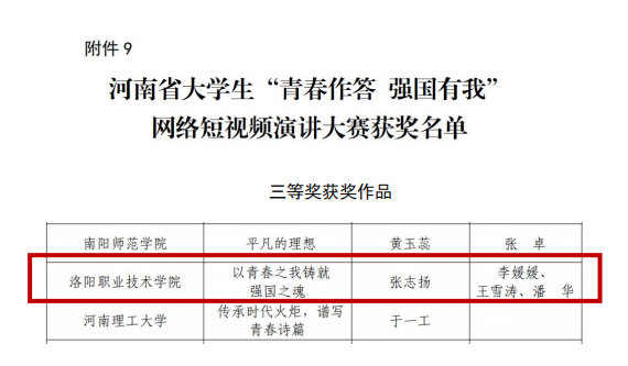 二、河南省大学“青春作答 强国有我”网络短视频演讲大赛,作品《以青春之我铸就强国之魂》荣获三等奖。