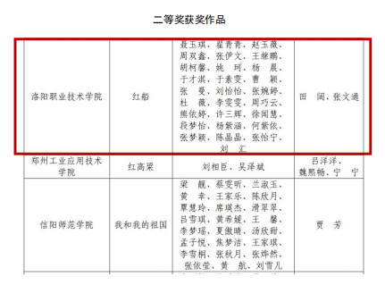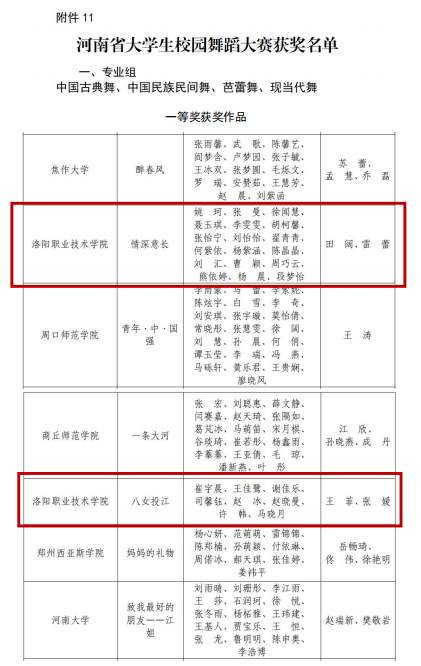 四、河南省大学生校园舞蹈大赛,作品《情谊深长》《八女投江》荣获专业组一等奖,作品《红船》荣获专业组二等奖。