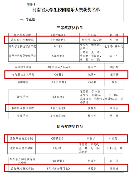 一、河南省大学生校园乐器大赛,作品《十面埋伏》《春舞》《牧民新歌》荣获专业组三等奖,作品《箜篌引》《肖邦革命练习曲》荣获专业组优秀奖。