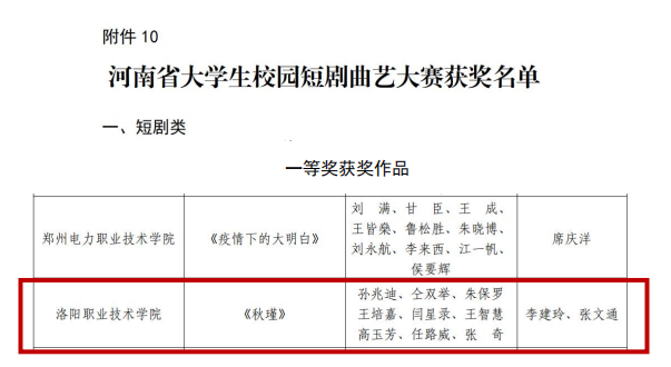 三、河南省大学生校园短剧曲艺大赛,作品《秋瑾》荣获一等奖。