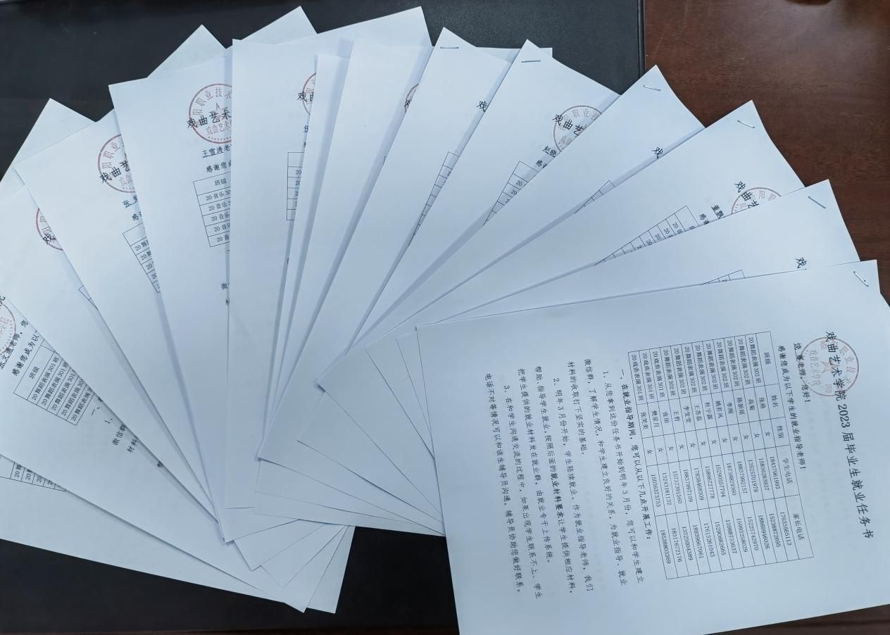 此外,我院创新就业工作形式,精心设计了戏曲艺术学院2023届毕业生就业工作任务书,并加盖公章。学院领导为为每一位就业指导老师颁发任务书,增添仪式感,让全体教师从思想上认识到就业工作的重要性,切实做好学生就业指导工作。