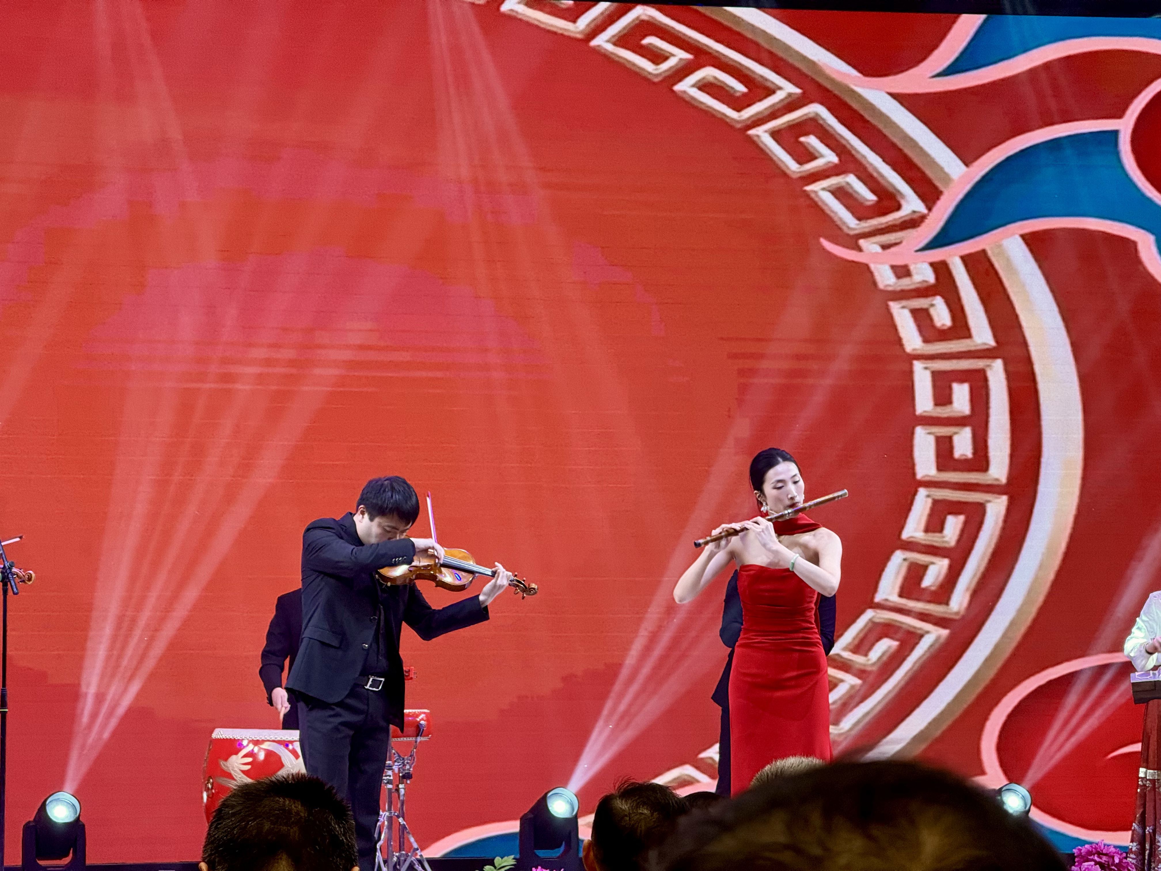 器乐合奏《新春乐》由丁南老师改编,由其担任小提琴领奏,刘佳欣老师担任竹笛领奏,并由洛阳交响乐团(洛阳爱乐乐团)伴奏完成。这一传统与现代结合的改编版本,旋律悠扬、节奏欢快,为现场嘉宾带来了浓浓的年味和节日的喜庆氛围。